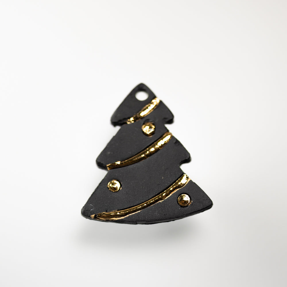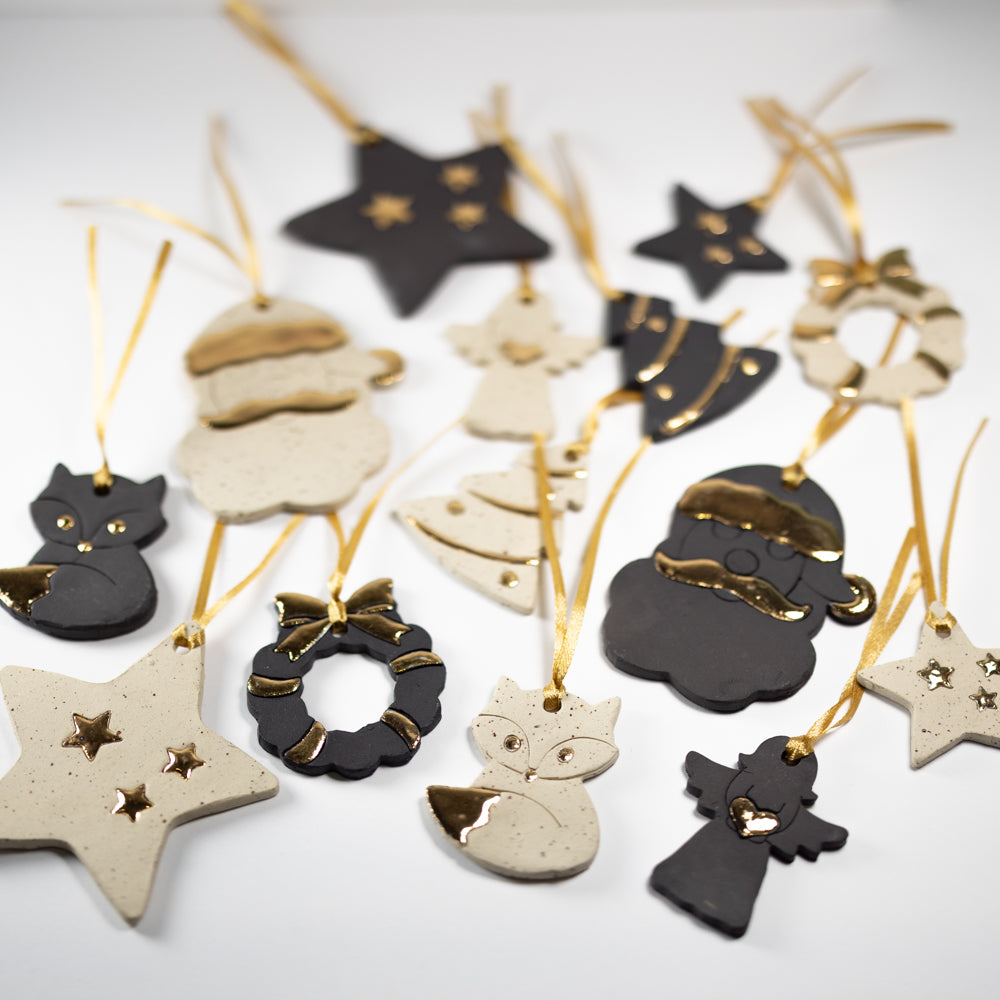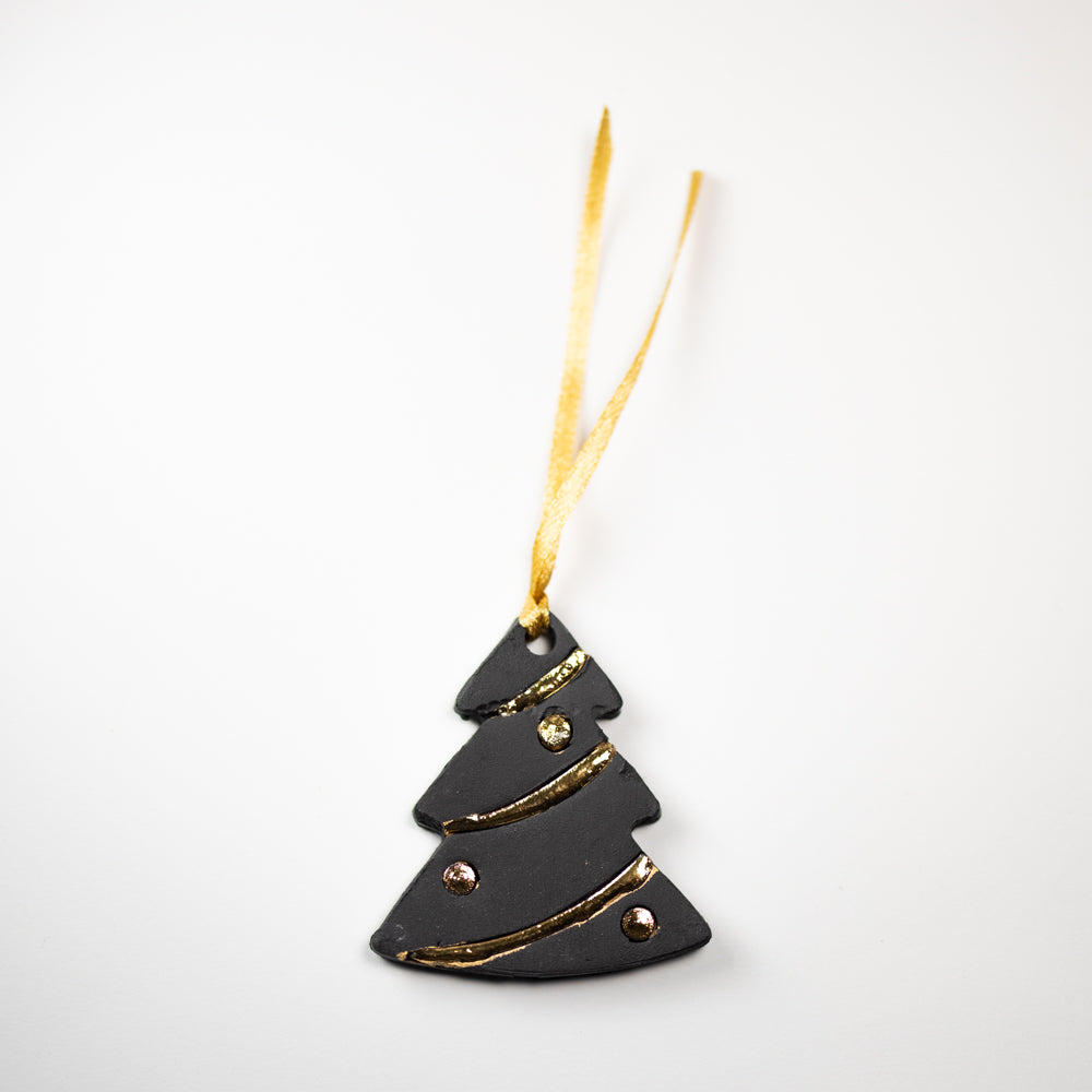 Handgemaakte kerstornament verfraaid met details in echt 22 karaat goud. Elk stuk is zorgvuldig vormgegeven in ruwe klei en uniek. Met de warme glans van het goud is het een schitterende toevoeging is aan elke kerstboom.