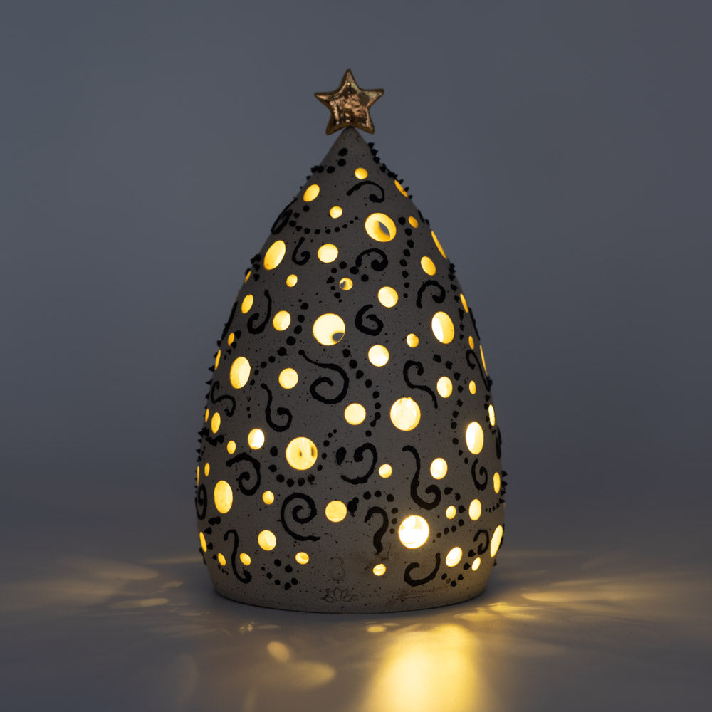 The carefully cut openings allow candlelight to glow gently from within, casting a warm and tranquil play of light and shadow. At the top, a hand-applied 22-carat gold star adds a refined finishing touch, subtly catching the light and elevating the piece.